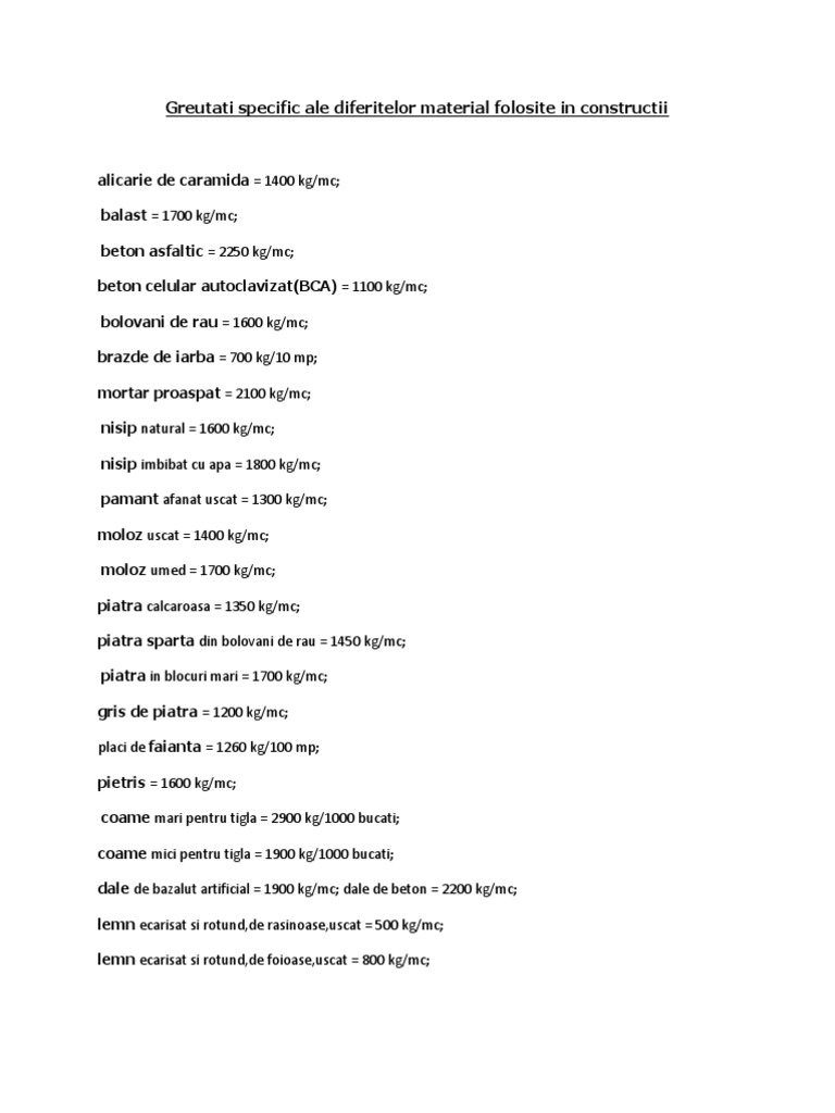 Greutati Specifice Ale Diferitelor Materiale Folosite In Constructii