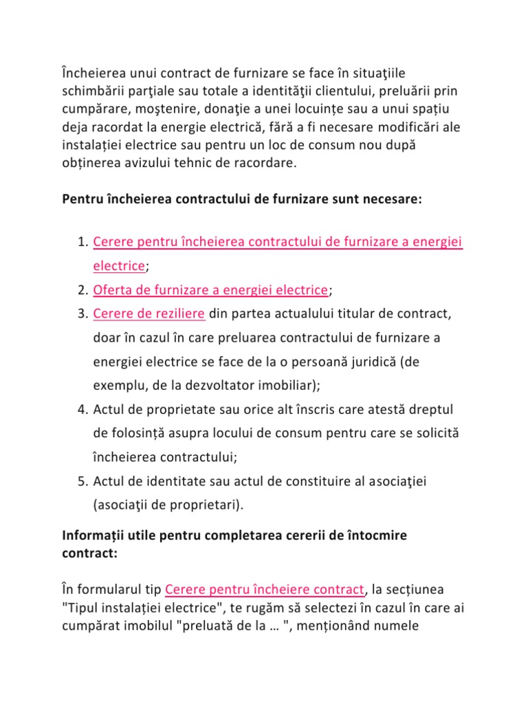 încheierea unui contract de furnizare se face în situaţiile schimbării parţiale sau totale a identităţii clientului preluării prin cumpărare moştenire donaţie a unei locuințe sau a unui spațiu deja racordat la energie electrică fără a fi necesare modificări ale instalației electrice sau pentru un loc de consum nou după obținerea avizului tehnic de racordare. Actele necesare pentru racordarea la reţeaua de energie electrica şi pentru a încheia contractul de furnizare a energiei electrice sunt. Află mai jos ce documente sunt necesare pentru transferarea contractului pe numele tău. Firma noastra ofera servicii de schimbare titular contract enel in numai 3 zile lucratoare la tariful de 250 ron.