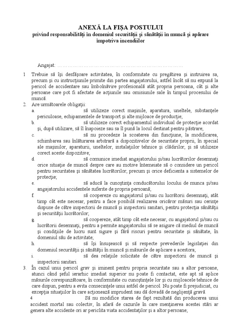 Anexa La Fisa Postului Privind Ssm Si Psi