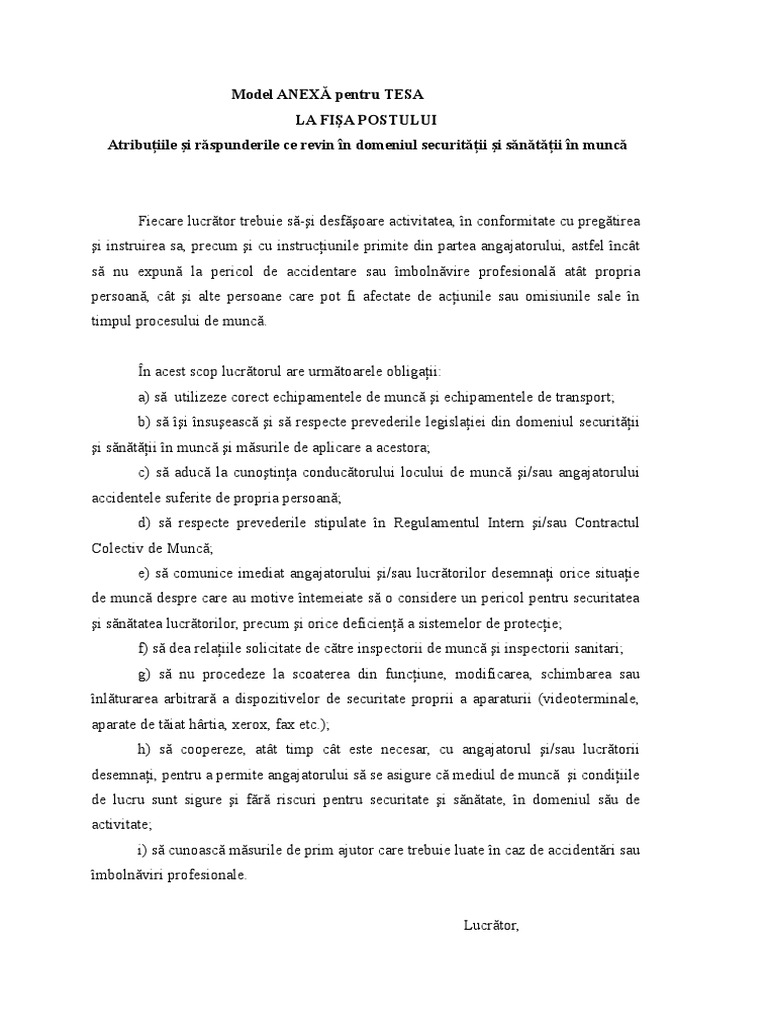 2 2 Anexa La Fisa Postului Personal Tesa Model