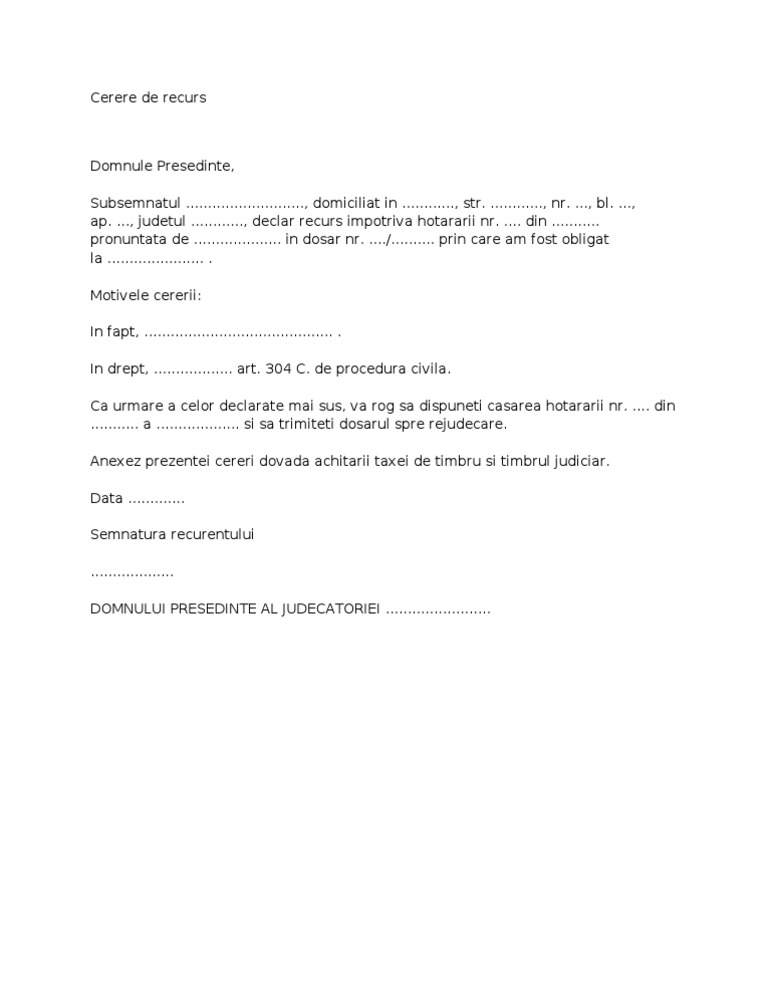 Model Cerere De Recurs