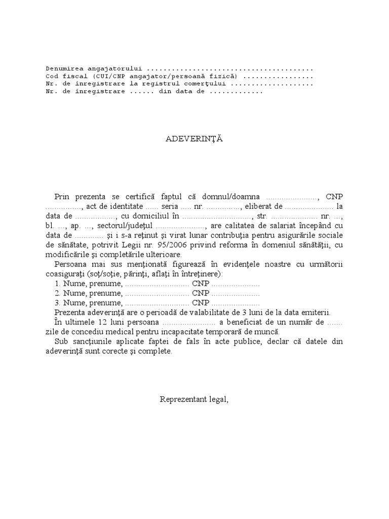 213 din lgea 95 2006. Cerere de obtinere a adeverintei de asigurat anexa1. Cererea privind obtinerea adeverintei care atesta calitatea de asigurat unde sa se regaseasca dovada platii contributiei va fi depusa la registratura cjas in vederea eliberarii adeverintei de asigurat. La solicitarea adeverintei de asigurat trebuie sa se prezinte documente care atesta plata contributiei de sanatate pe ultimii 5 ani 2004 2009 in cazul in care categoria de asigurat in care o persoana se incadreaza in prezent este mai recenta de 5 ani este necesar a se depune documente justificative corespunzatoare categoriei categoriilor de asigurat in care s a incadrat anterior.