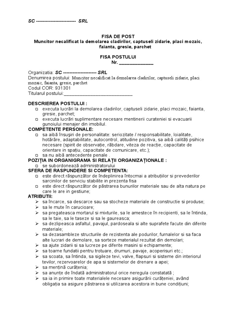 Fișa Postului și Fișă De Evaluare A Performanțelor Individuale Pentru Muncitor Necalificat La Spargerea Si Tăierea Materialelor De Construcţii Cod Cor 931302