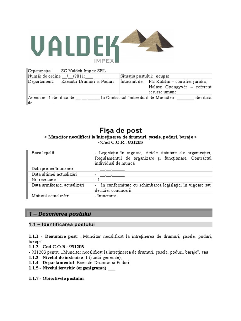 Fișa Postului și Fișă De Evaluare A Performanțelor Individuale Pentru Muncitor Necalificat La Intreţinerea De Drumuri Sosele Poduri Baraje Cod Cor 931203