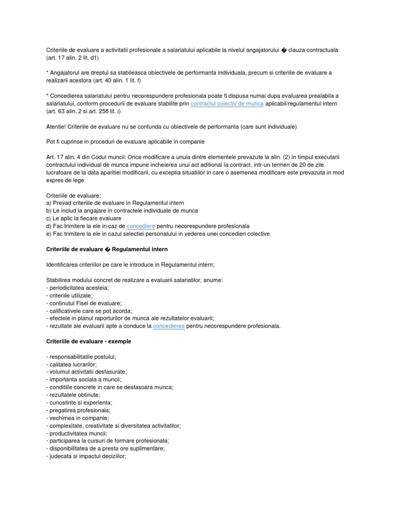 Criteriile De Evaluare A Activitatii Profesionale A Salariatului Aplicabile La Nivelul Angajatorului
