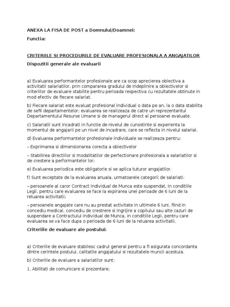 Anexa La Fisa De Post Criterii De Evaluare