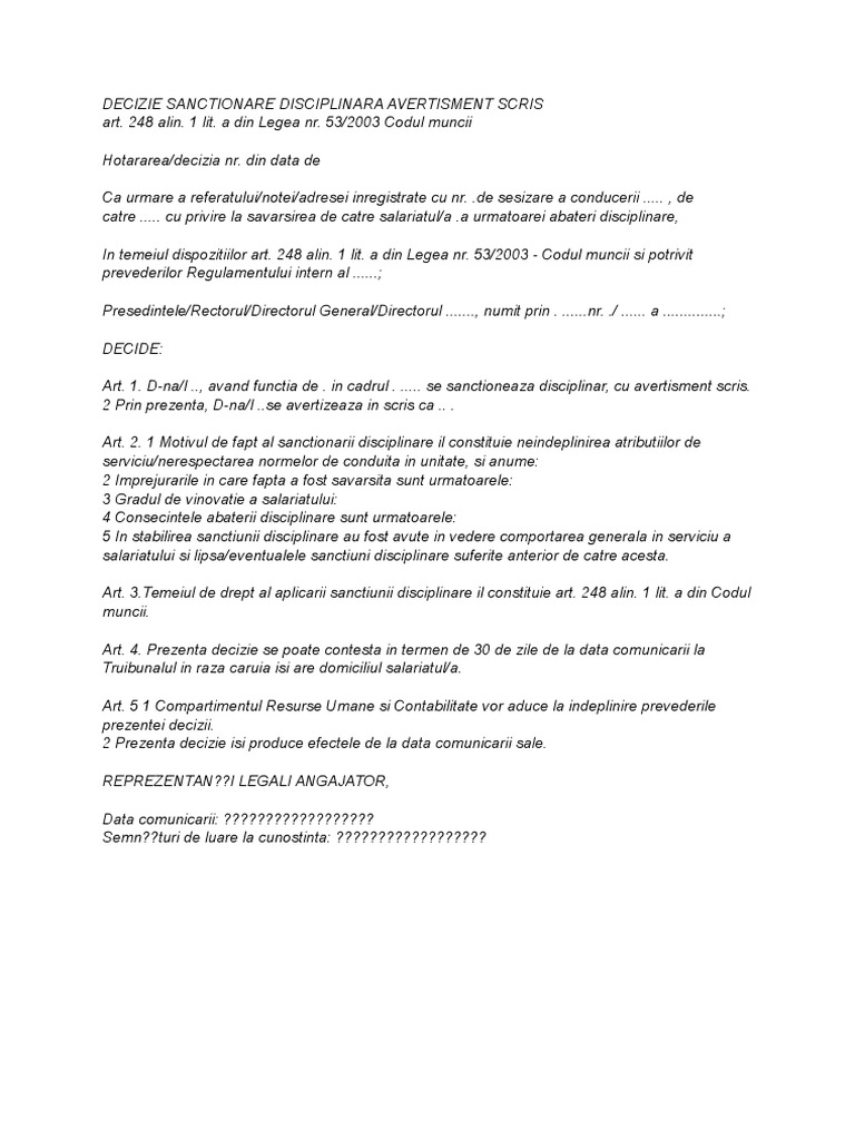 Decizie De Sanctionare Disciplinara Avertisment Scris