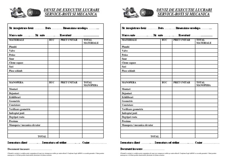 Deviz De Executie Lucrari Service Roti Si Mecanica