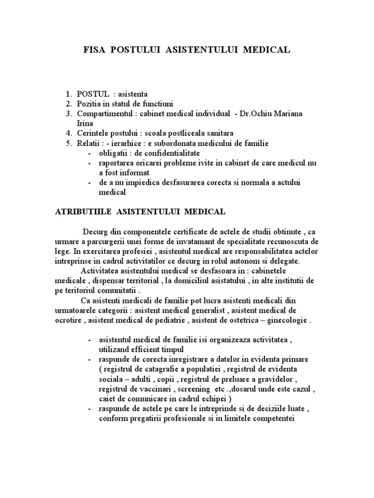 Fisa Post Asistent Medical Generalist Pl Marius Nasta Ro A Prin Studiu Individual Sau Alte Forme De Educatie Continua Si Conform Ceringelor Planifica Interventiile Pdf Document