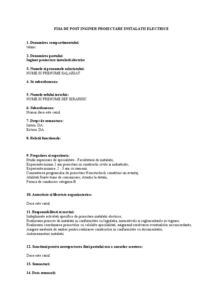Fisa De Post Inginer Proiectare Instalatii Electrice