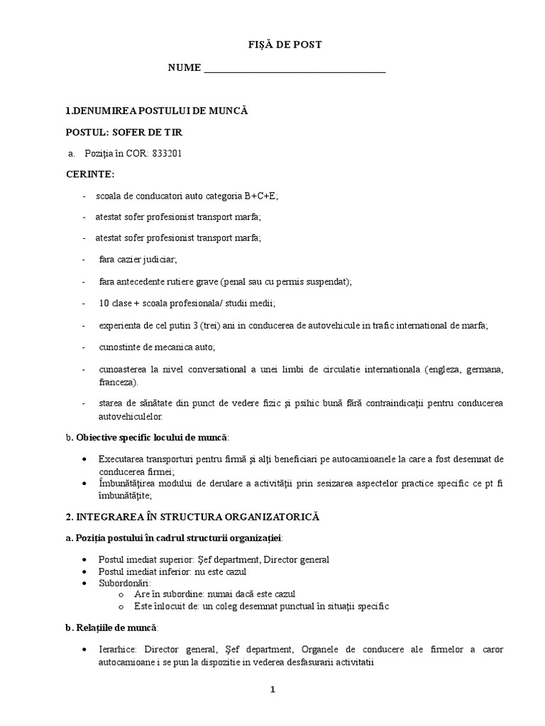 Fisa Postului Sofer Autocamion Masina De Mare Tonaj