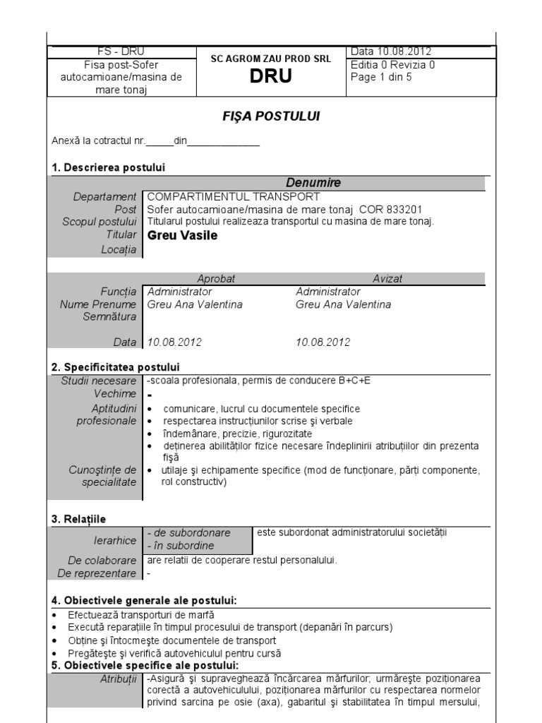 Fisa De Post Sofer Autoturisme Si Autocamioane Pdf