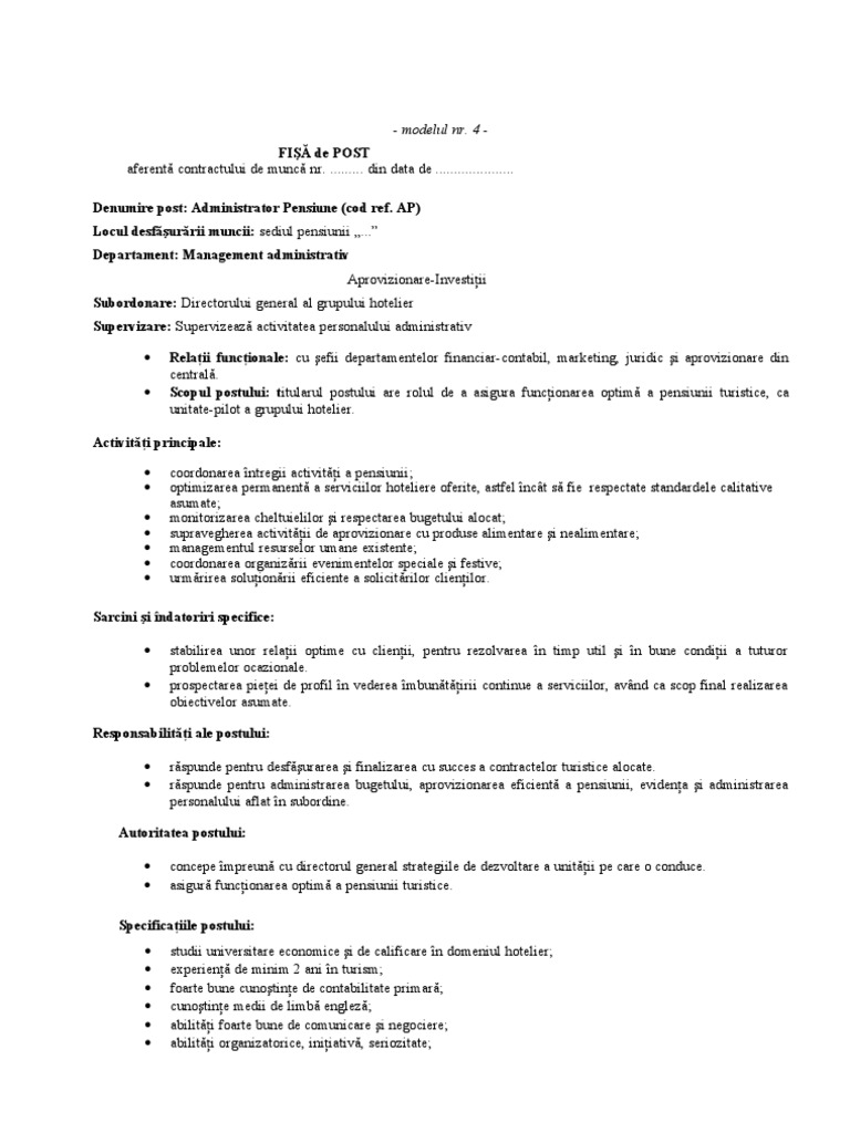 Fisa De Post Administrator Pensiune Turistica