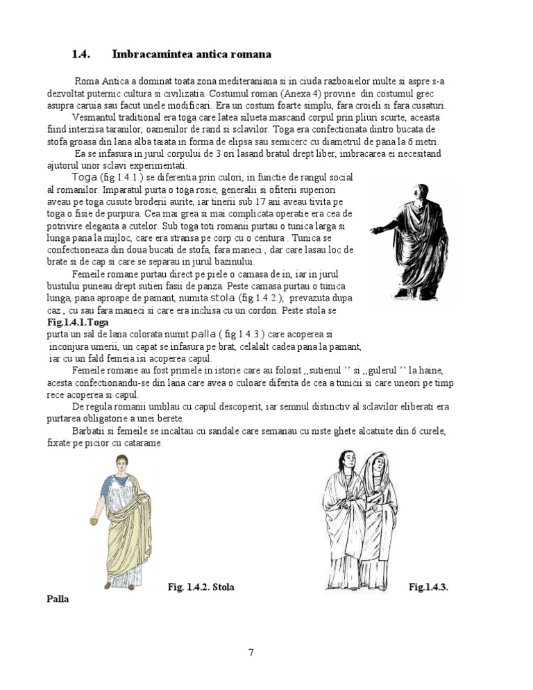 Imbracamintea in roma antica. Veşmântul oficial al romanilor dar care era interzis ţăranilor muncitorilor simpli şi sclavilor era toga. Mult mai comode însă mai practice şi mai puţin costisitoare erau sandalele. Ea a dominat europa de vest și întreaga arie în jurul mării mediterane prin cuceriri și asimilare însă. Imbracamintea in grecia antica.
