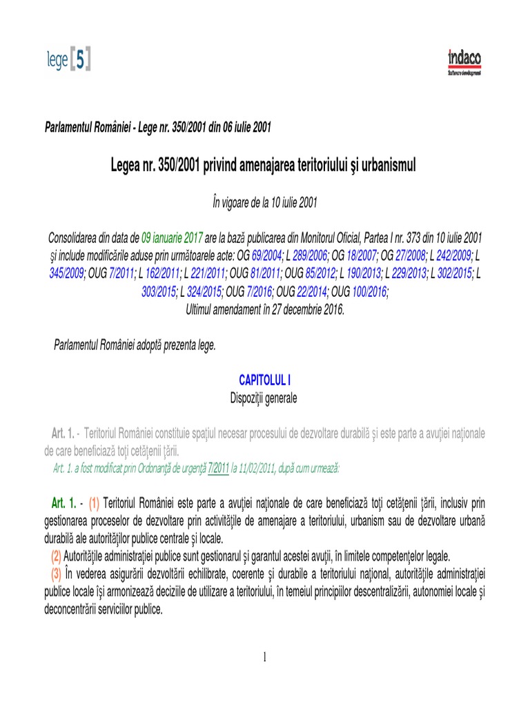 Legea Nr 350 2001 Privind Amenajarea Teritoriului Si Urbanismul Actualizata 29 08 2008