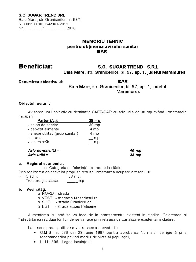 234792 lot 1 sector 5 bucuresti. Denumirea numele solicitantului şi date de identificare ale acestuia. Memoriu tehnic pentru obţinerea avizului sanitar. E memoriul tehnic justificativ cu descrierea activităţii a utilajelor şi ustensilelor a procedurilor de lucru capacitatea de producţie depozitare ambalare după caz.