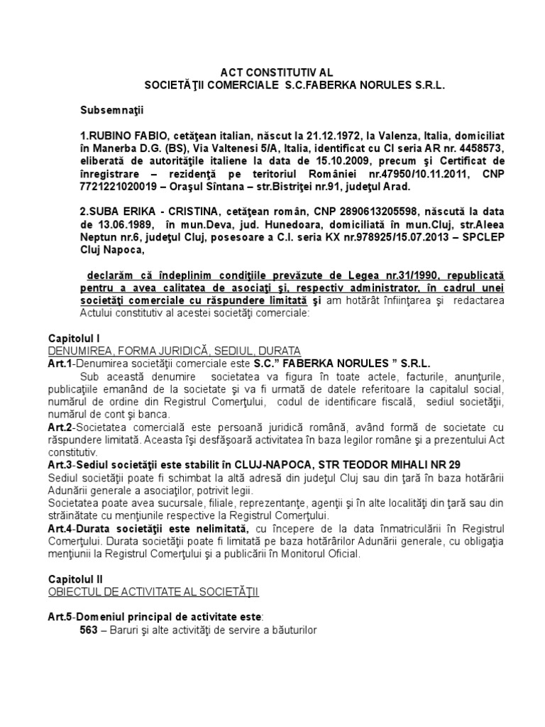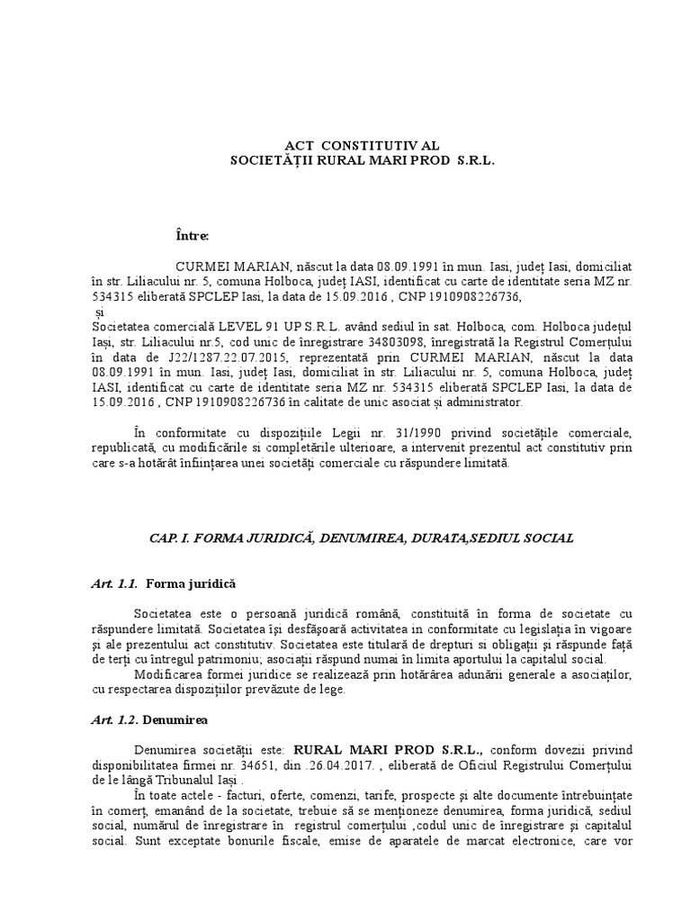 Capitolul I Denumirea Forma Juridica Sediul Si Durata Societatii
