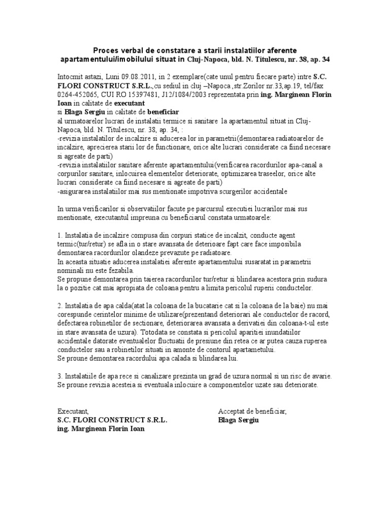 Proces Verbal De Constatare A Starii Instalatiilor Aferente Apartamentului
