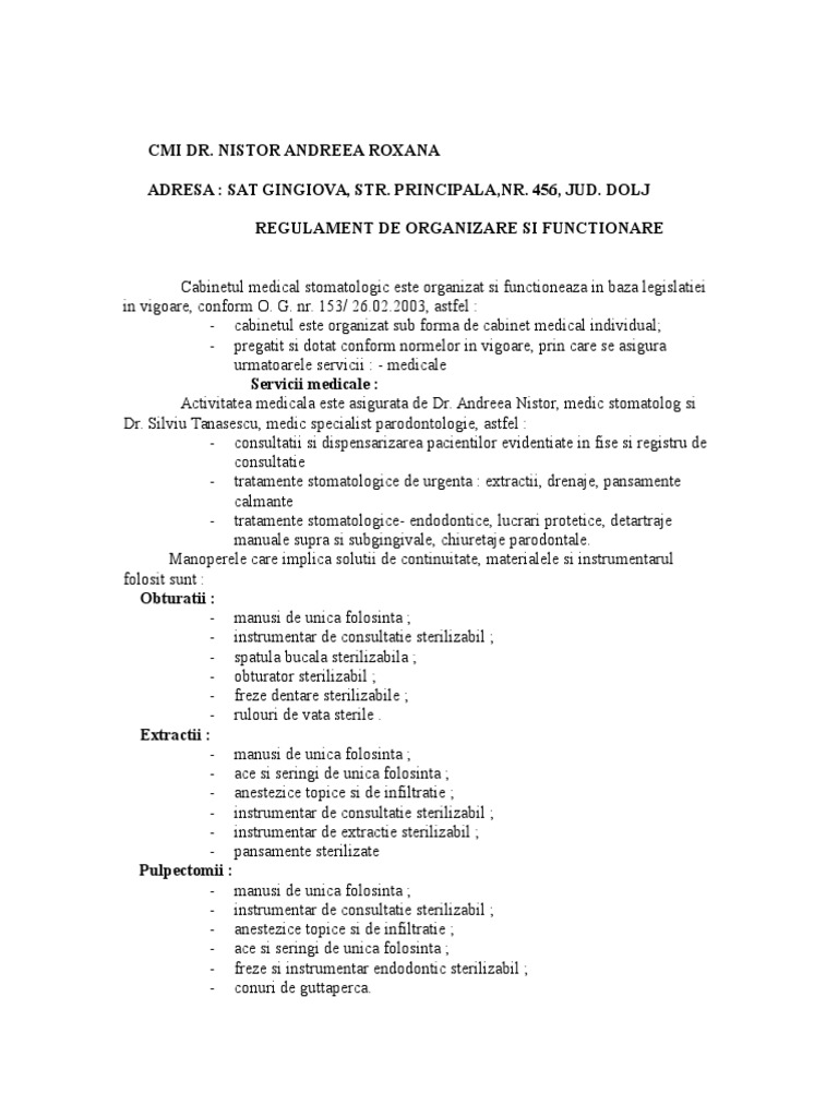 Regulament Functionare Cabinet Stomatologic