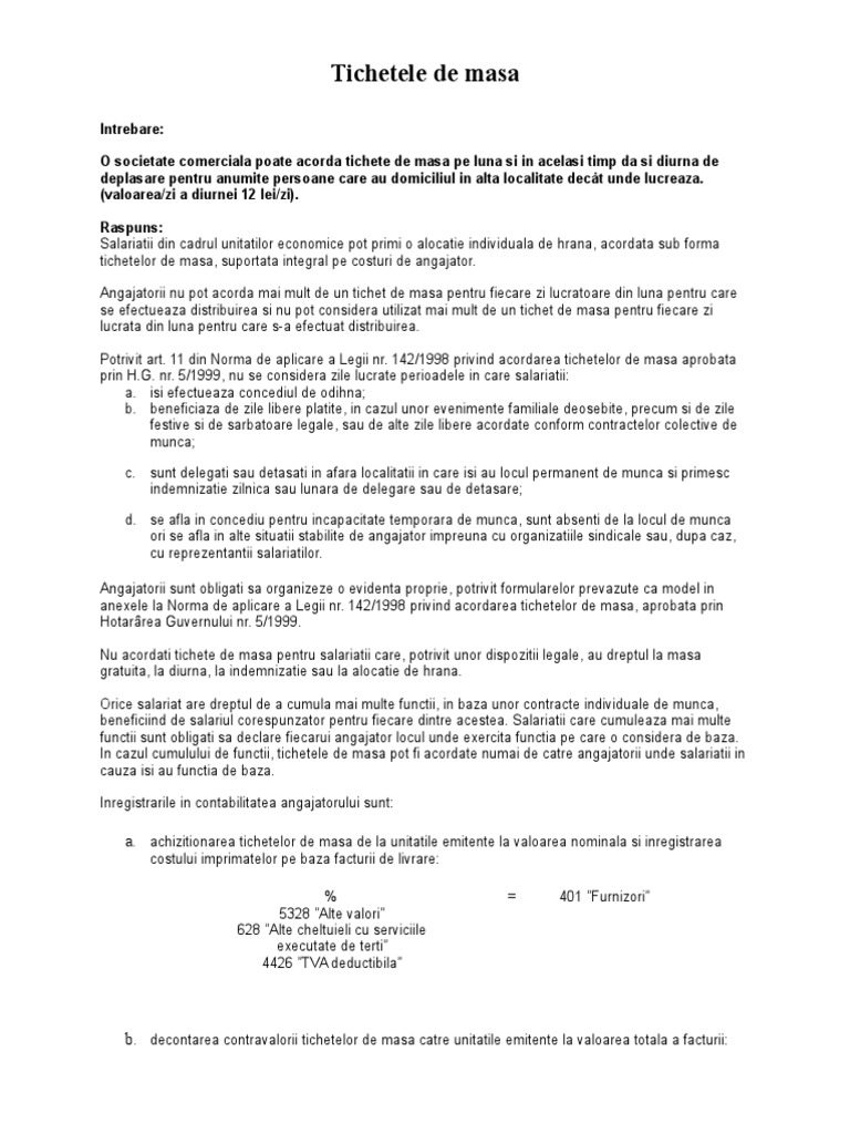 Acordarea Tichetelor De Masa Monografie Contabila Contabilitate Fiscalitate Monografii Contabile