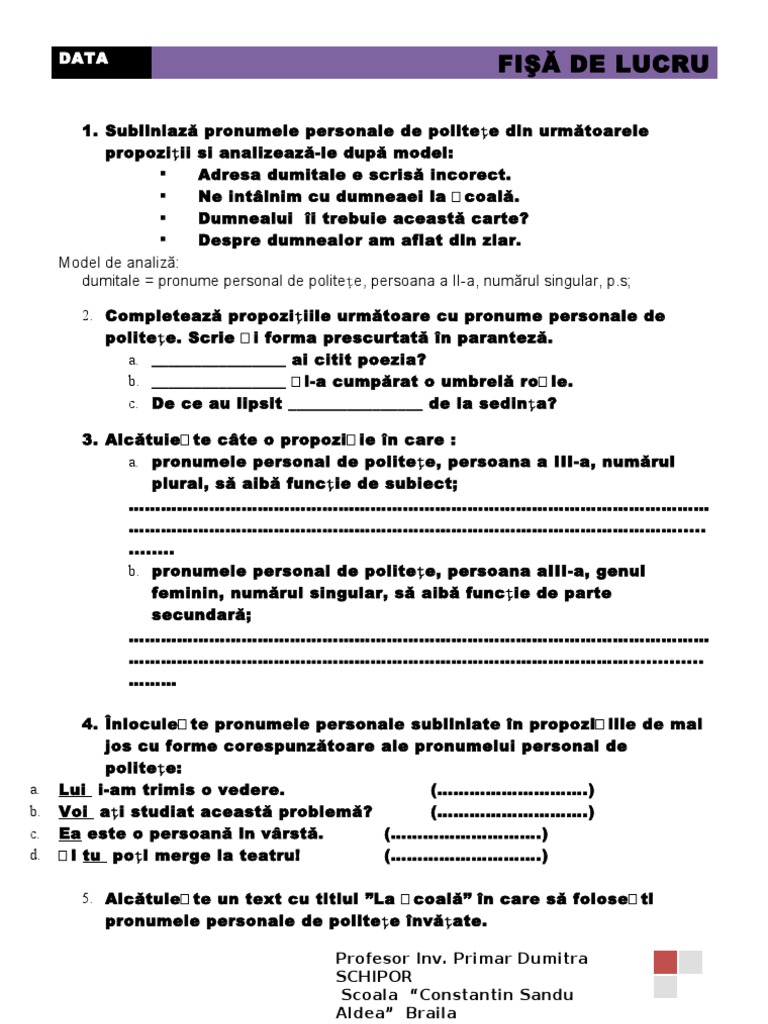 Fisa De Lucru Pronumele Personal De Politete