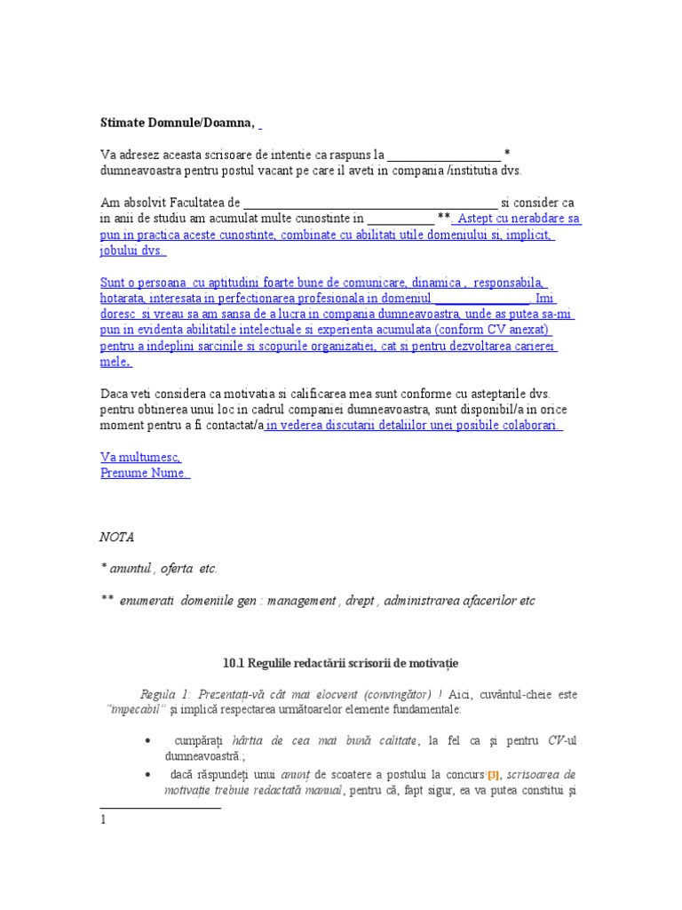 Model Scrisoare De Intentie Motivatie